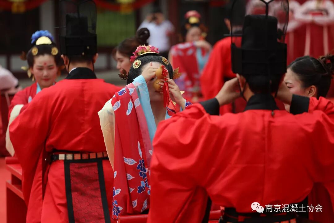 此次集体婚礼中式仪式在古城西安大唐芙蓉园紫云楼隆重举行,15对新人在唐风古韵的皇家园林中举行了一场繁华盛大的唐制婚礼。上午9点08分, 15位身着华美唐式喜服的新娘,缓缓入场,众新人依六礼之制,行夫妻之礼。庄重的唐制婚仪再现了盛唐文化的厚重与灿烂,建华众新人内修敬畏,外制行为,更坚定了相守一生的信念。